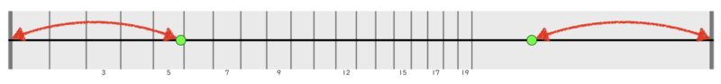ハーモニクスはフレットの真上の弦に触って…とよく言いますが、実は違います。5等分のハーモニクスは4・9・16…フレットの近くです。